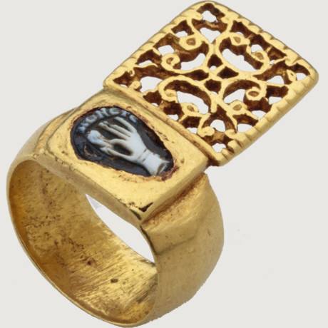 Uno dei cammei più particolari fu ritrovato nel 1924, e raffigura una mano che con l’indice ed il pollice tira un lobo d’un orecchio, il tutto coronato da un’iscrizione greca, MNHMÓNEYE, ovvero “ricorda” – un motivo che si trova ripetuto nel corso del tempo, come in questo anello-chiave di III-IV sec. d.C.
