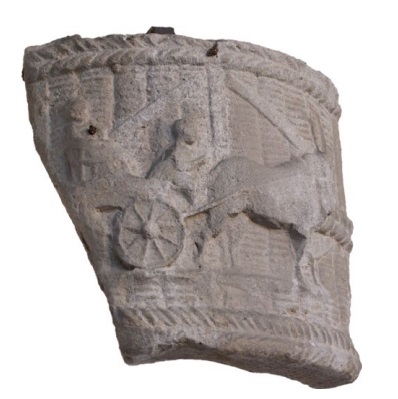 scena di trasporto: il viaggiatore siede in una carruca, trainata da una capra, simbolo in questo caso di viaggio molto particolare: quello verso l’oltretomba; I secolo d.C.