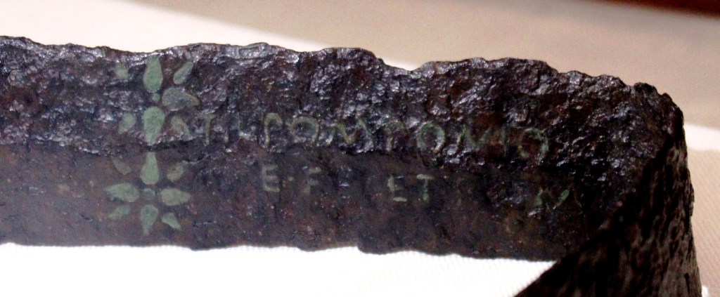 Ciò ci è noto dall’iscrizione sulla lama, che recita: “T(rebios) Pomponios C. [filius?] me fecet Roma(i)”, ovvero “Trebio Pomponio, figlio di Caio, mi fece a Roma”.