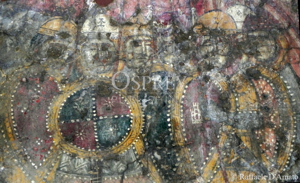 Come nei secoli precedenti, anche gli scudi di questo periodo storico erano certamente dipinti come mostrano bene le fonti iconografiche, e le fonti del IX e X secolo (es. Taktikà di Leone VI e la Sylloge Tacticorum) specificano piuttosto bene come gli scudi dei soldati appartenenti alla stessa unità dovessero essere dipinti con gli stessi colori o con gli stessi simboli. Ciò che emerge anche da alcune fonti visuali dell’XI-XII secolo, che mostrano gruppi di soldati con scudi decorati allo stesso modo.