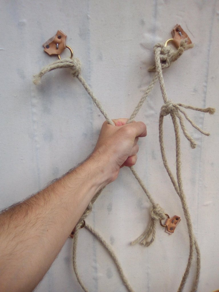 Si diffonde inoltre anche un altro tipo di presa centrale, detta “a chiasmo”, costituita da due brevi corde fissate allo scudo tramite anelli. La mano del guerriero stringe le due corde nel mezzo, andando così a creare una sorta di impugnatura.