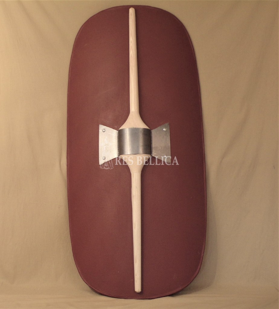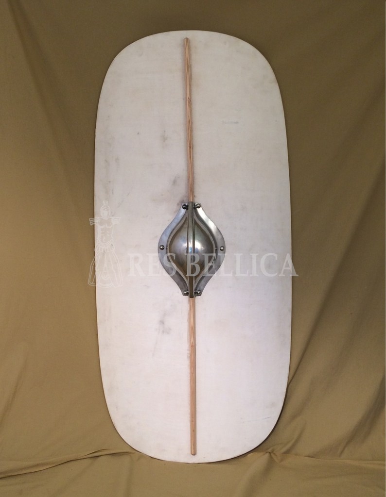 Lo scudo è formato da due strati di legno uniti con colla di bue, con la superficie esterna ricoperta prima con tela di lino e poi con pelle di vitello. L’orlo superiore e inferiore ha una bordatura in ferro per proteggerlo dai fendenti e dall’usura quando poggia a terra. Su di esso è anche fissato un umbone di ferro, per resistere ai colpi più formidabili di pietre e sarisse, e in generale da proiettili pesanti.”