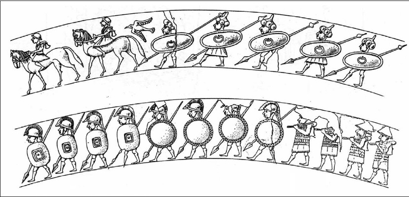 Si notano molto bene gli opliti armati di clipeus, in numero molto minore rispetto ai guerrieri armati di scudo oblungo a manopola.
