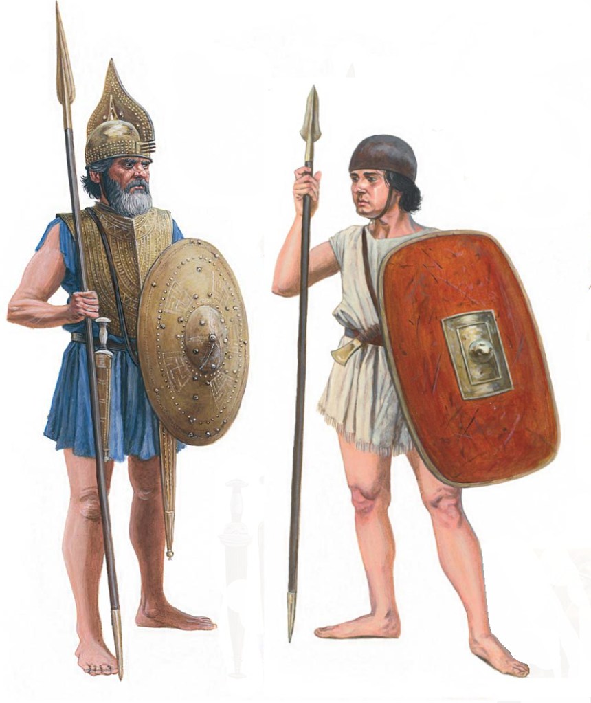 Mentre i pochi aristocratici presenti erano i guerrieri a cavallo, armati probabilmente con spade e asce in bronzo, scudi tondi in metallo, elmi e rudimentali armature pettorali anch’essi di bronzo, la gran massa dei fanti sarà stata armata con scudi oblunghi a manopola centrale in materiale organico (scutum o thyreos), lance e forse armi secondarie come pugnali e asce.