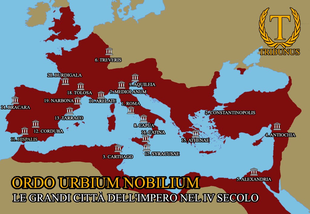 Ausonio stila così una “classifica” delle venti città dell’impero romano del suo periodo che considera le più importanti o prestigiose – alcune città sono tra loro messe sullo stesso piano.