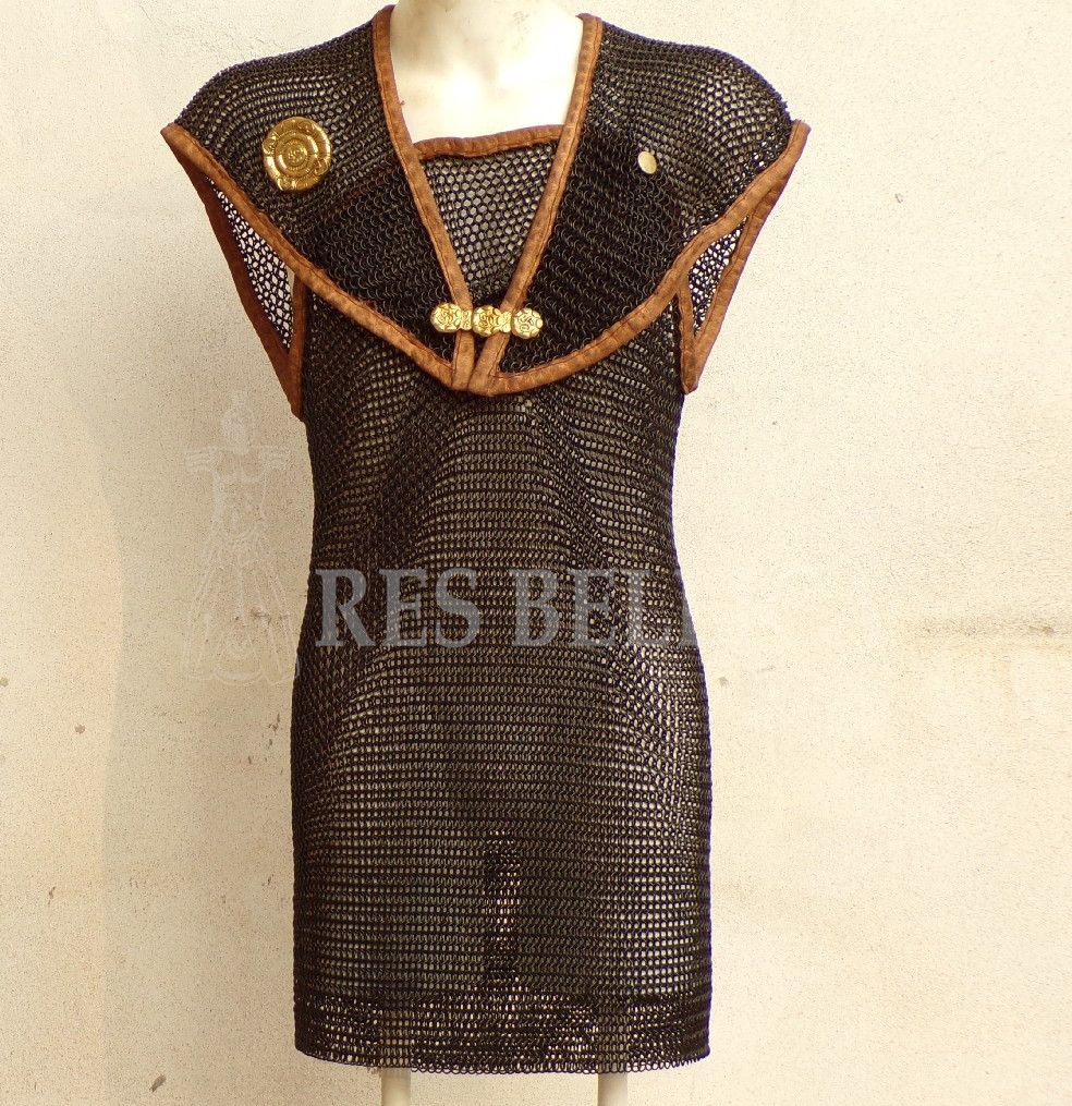 Da quanto ne sappiamo, all’inizio queste armature, composte da una trama di anelli intrecciati tra loro (lo schema più usuale è quello “4 in 1”), ricalcano proprio la forma delle armature a corsaletto con spallacci, con un corpo tubolare e due spallacci che si fissano sul petto.