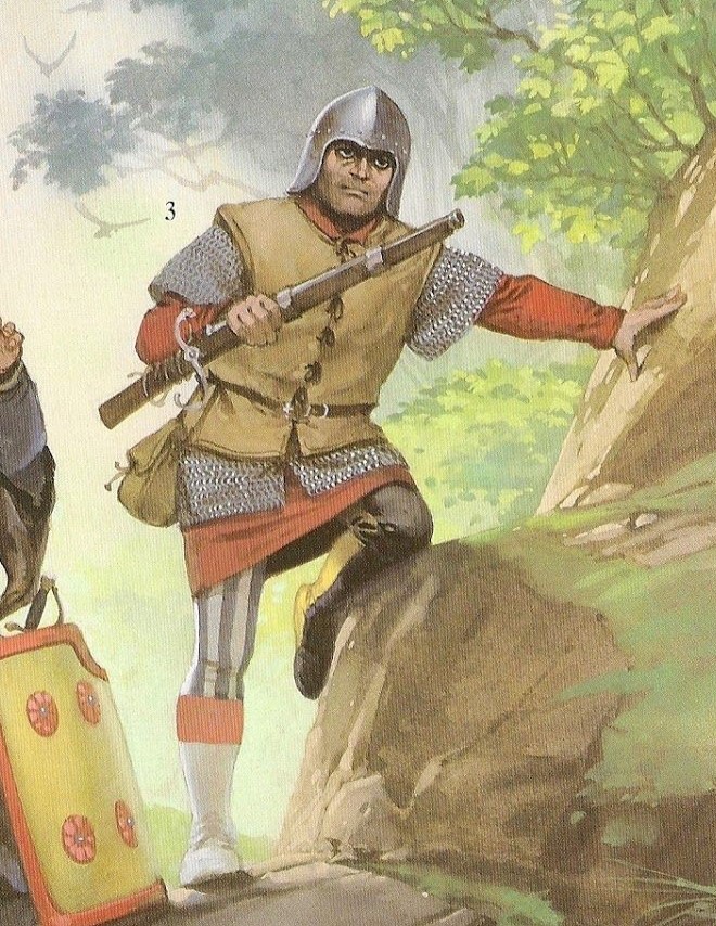 Tra i difensori di Costantinopoli si possono poi contare anche alcuni schioppettieri, dotati di armi portatili, presumibilmente manesche – costituite da una semplice e corta canna montata in cima a un’asta.
