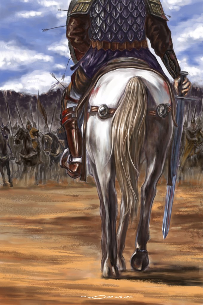 Quando finalmente Armouris diviene forte, in grado di combattere e di conseguenza in grado di montare in sella al cavallo del padre, si dirige verso oriente, oltre la frontiera, percorrendo più di sessanta miglia.