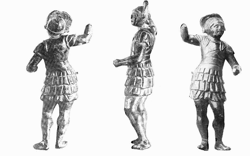 Per una prima testimonianza più o meno chiara di una figura che probabilmente è un centurione e che reca sul capo una cresta trasversa, dobbiamo affidarci a un bronzetto di provenienza sconosciuta, rinvenuto nel 1925 e oggi al Museo Nazionale delle Terme (Roma).